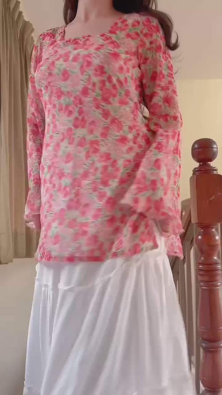Meet Bloom — a kurti that feels like it blossomed straight out of an enchanted woodland. With soft pink tulip patterns and hints of green, it captures the dreamy aura of a forest fairy dancing among wildflowers.